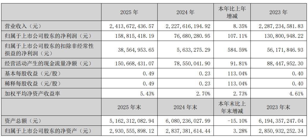 2025年汉威科技实现营业总收入24.14亿元,同比增长8.35%;归属于母公司所有者的净利润1.59亿元,同比增长107.11%;基本每股收益0.49元,同比增长113.04%。